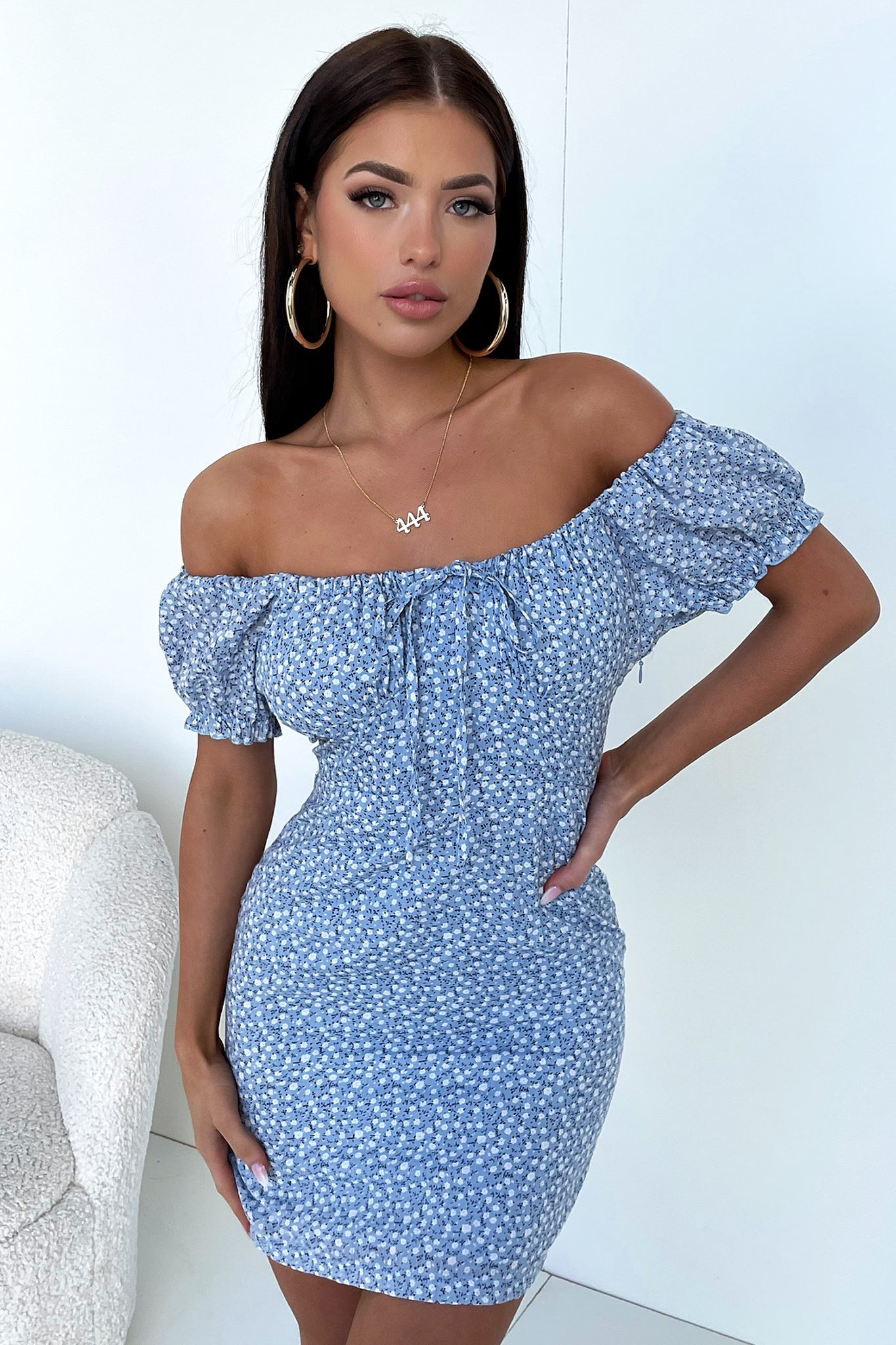 Can't get enough of pretty summer florals for days out in the sun. The Alma Dress in her pretty Purple, floral fabrication features off the shoulder sleeves, cupped bust with front tie up bow, invisible side zipper and flowing skirt. Complete your pretty girl vibe with chunky sneakers and take your bae out on a day date.