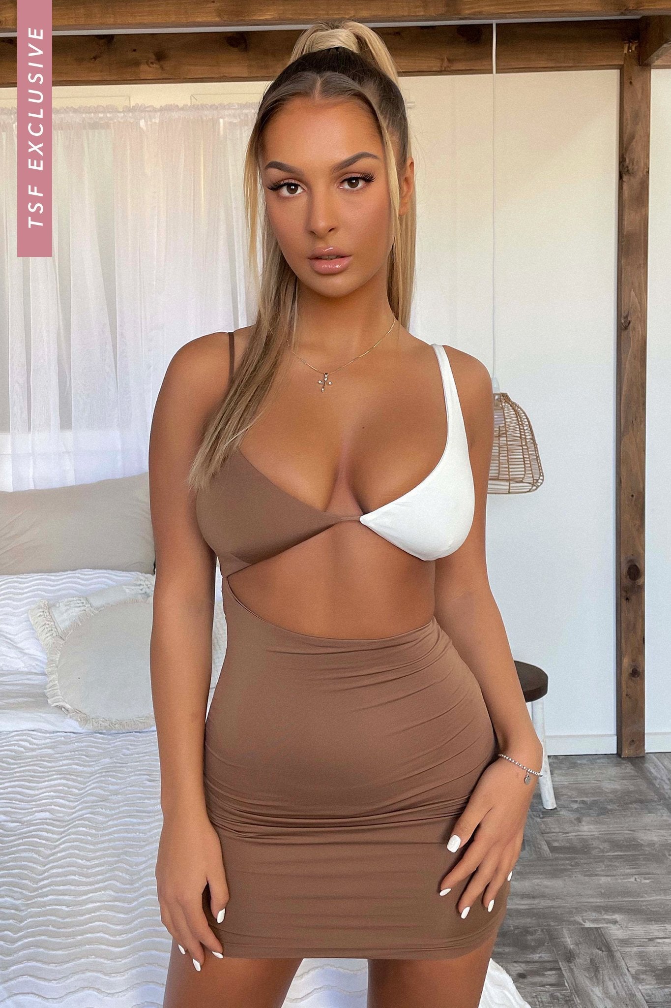 They wont be able to take their eyes off you when you walk in wearing the HOT NEW Giselle Dress. This babe features a contrast colour top, thin adjustable straps, a cut out deet all around the waist and a hot bodycon fit. Style this baddie with white nude heels, gold earrings, a nude lip and soft curls.