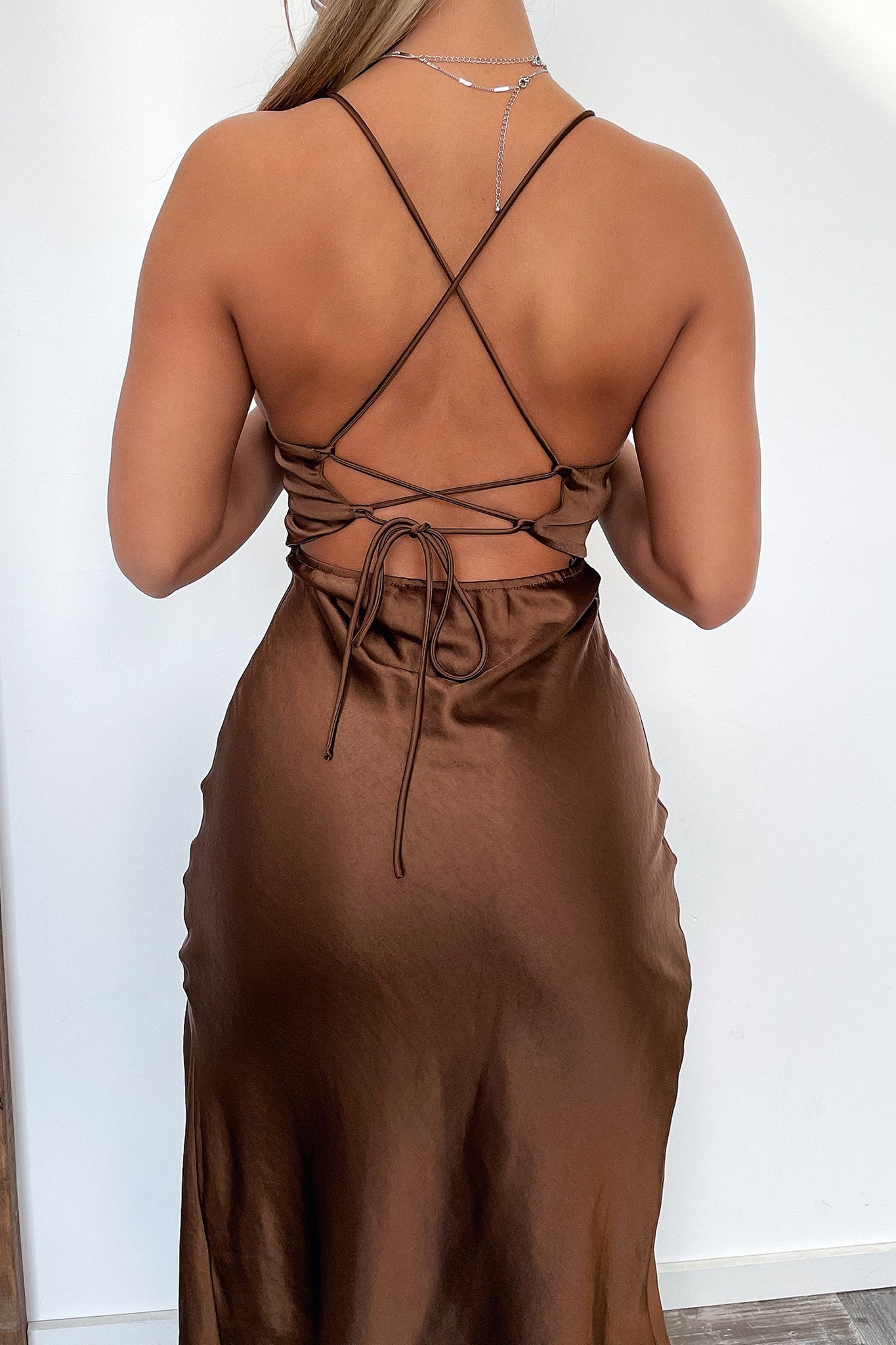 Walk in looking like the goddess you are in the new Zafari Dress. She showcases a silky satin material that is double lined, a v neckline, under bust lining, a slip on fit with a cheeky side split and an elegant lace up back design. Style her with nude heels, dainty gold jewellery and softly curled hair for a golden hour goddess look, at you next formal event.